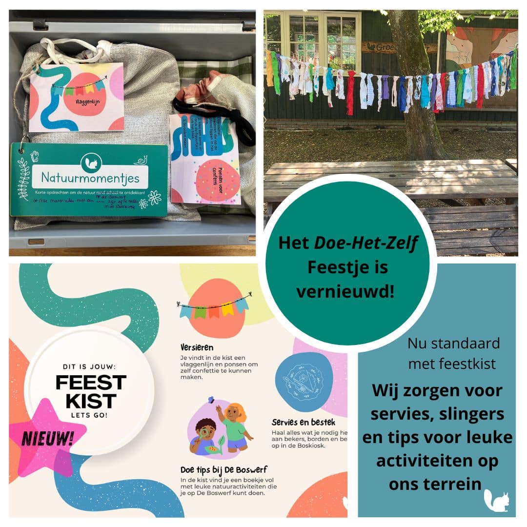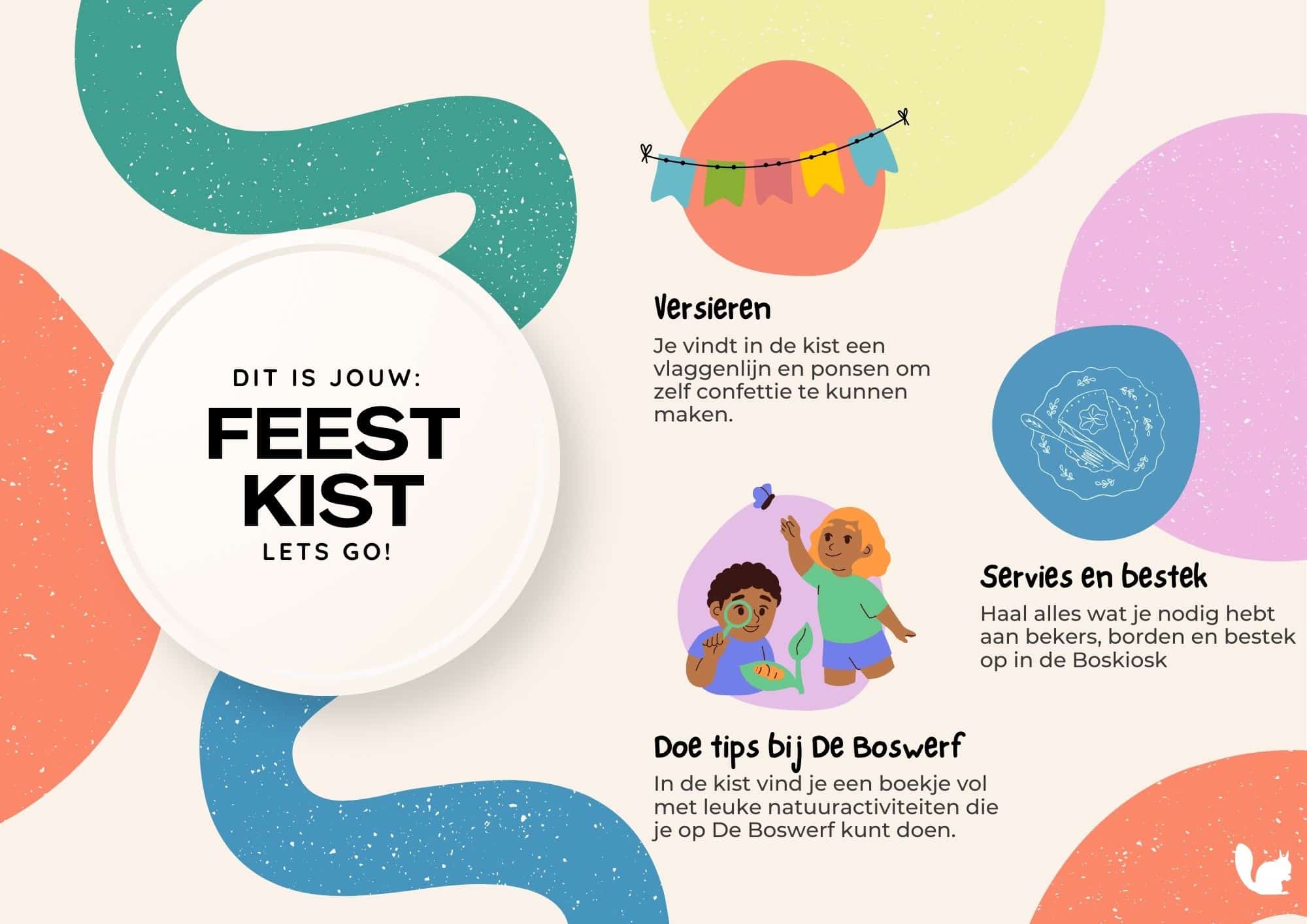 - Je meldt je op de afgesproken dag en tijd bij de Boskiosk en haalt de Feestkist af.